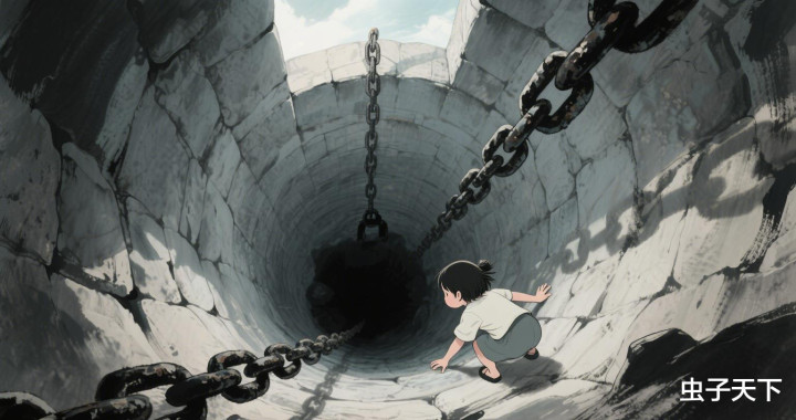 快到井底时,借着上方微弱的天光,我隐约看见井底深处锁着一团巨大的黑影,一条碗口粗的铁链从井壁的石环中穿出,死死捆着那东西。